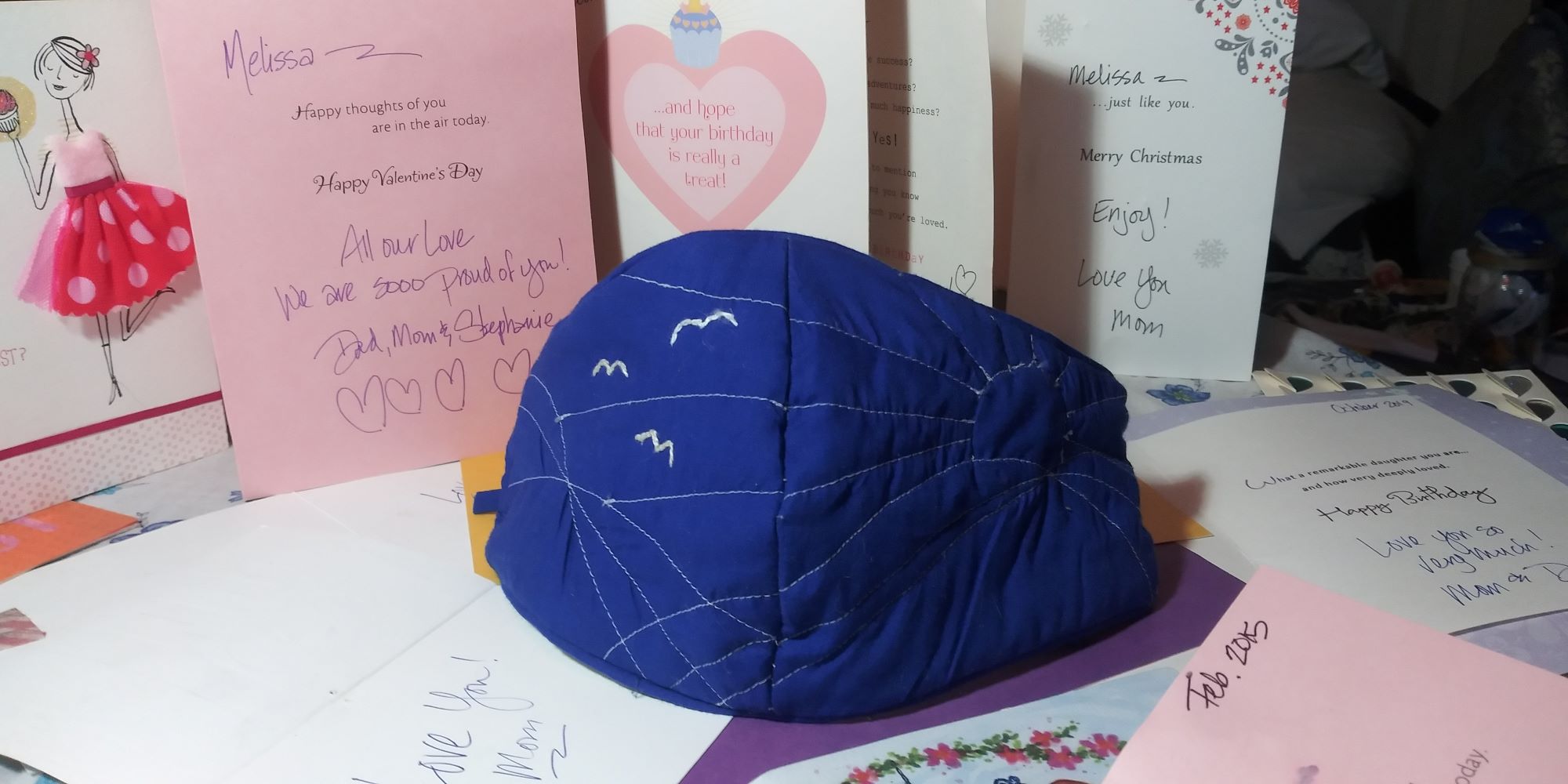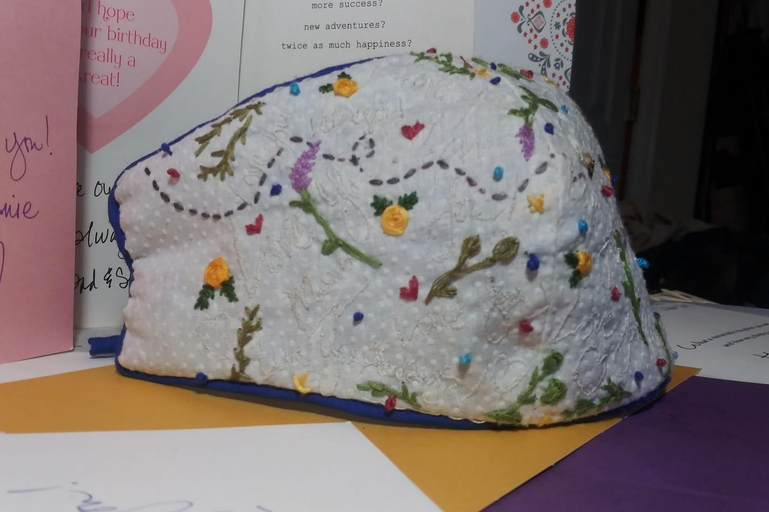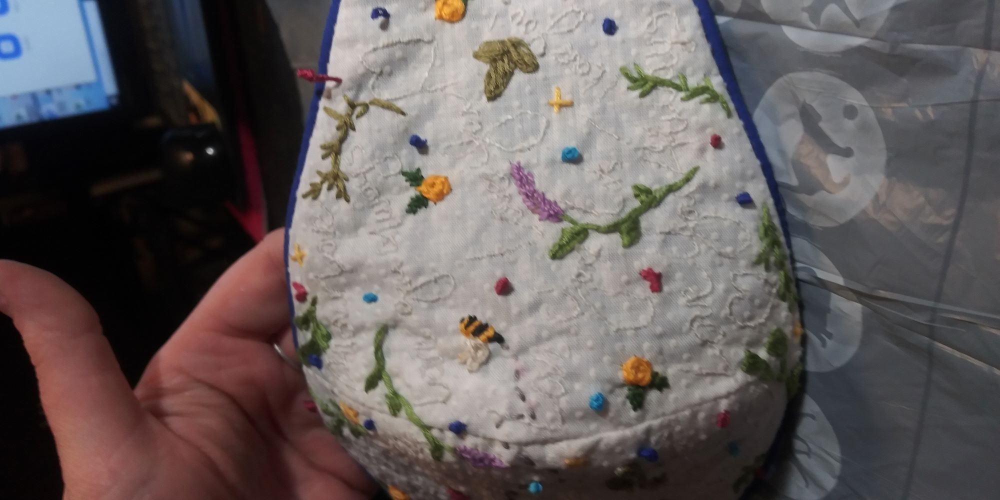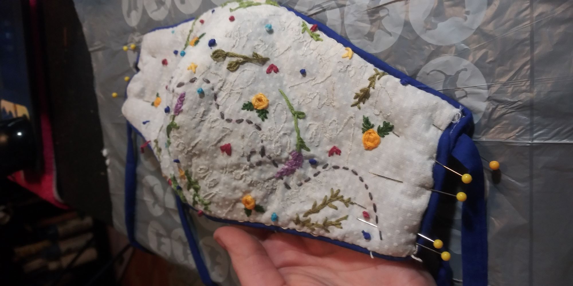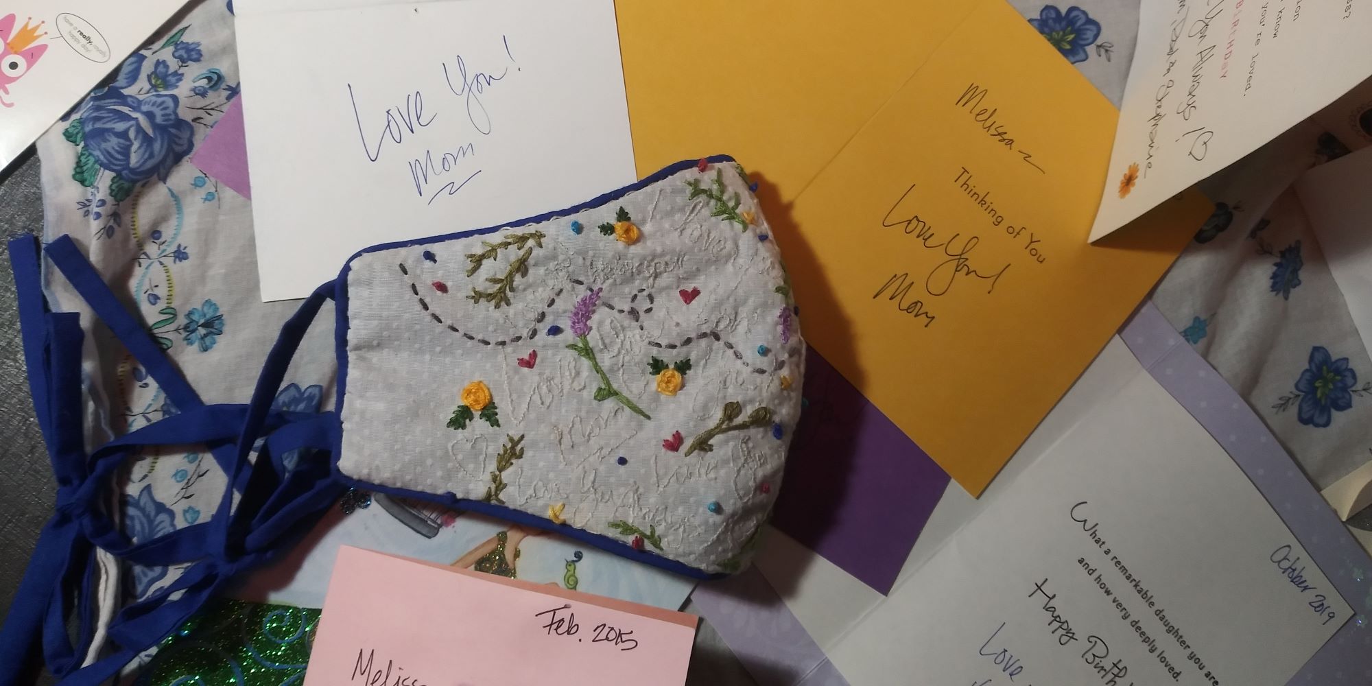 The front of the mask is embroidered with the closings of cards I have received over the years from my mother and sister. Some go back to before 2010. It was such a wonderful feeling to go back through all those cards from holidays, events, and even just Tuesdays and to see the physical manifestation of my mother’s love over time and distance.