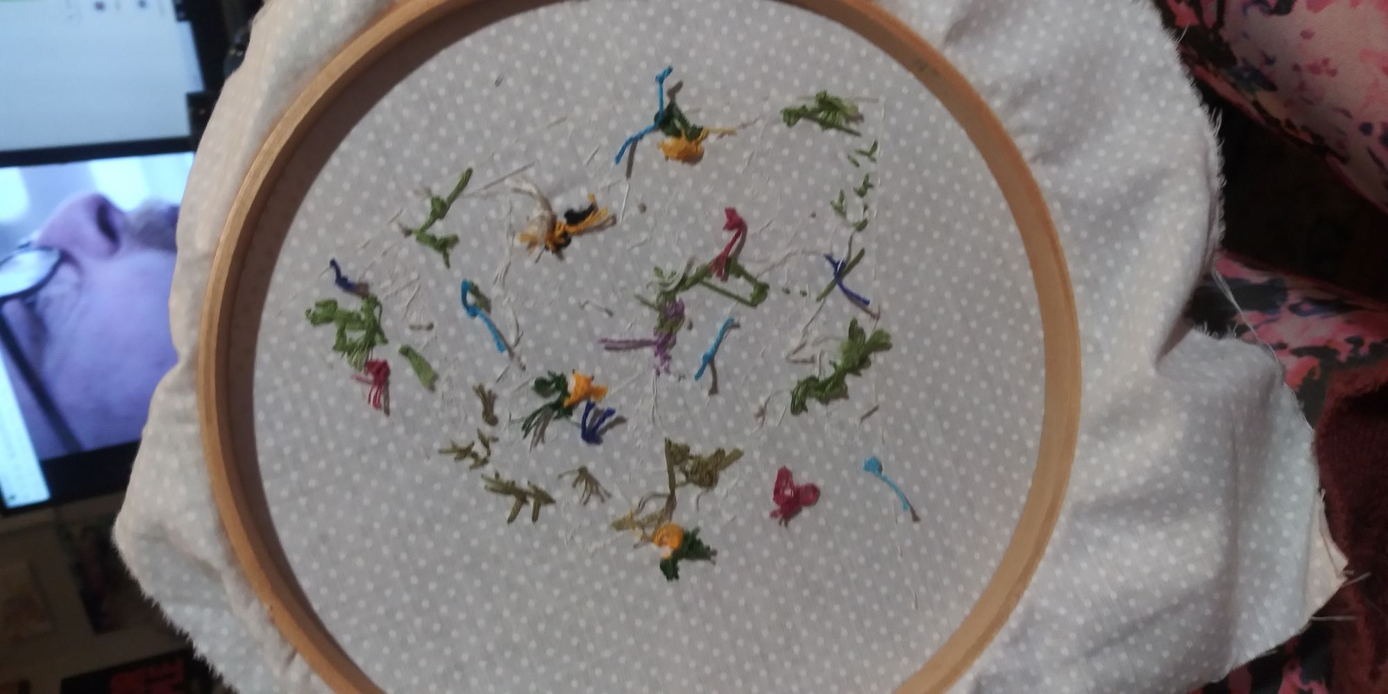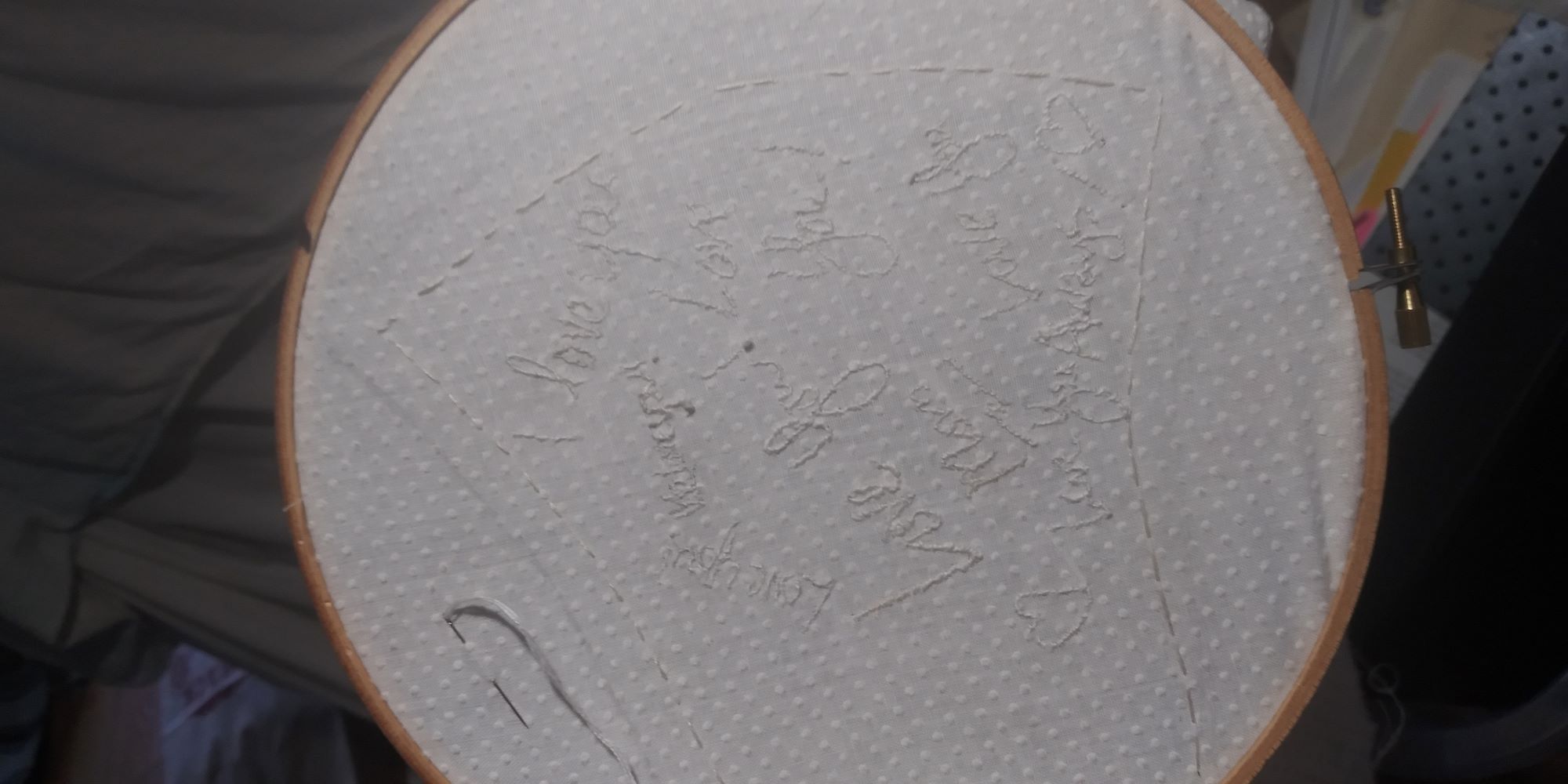 All of the “I love yous” are embroidered in white on white. You can’t see it from afar, but it’s there, entwined in the fibers. Words of love in an act of Love. The thread was my mother’s, she sent it to me so that I could use it - in an echo of my childhood. My mother used to have hobbies and then she had kids. One of those was cross-stitching and it felt so appropriate to use the embroidery floss that my mother gave up, for love, to create a new object of love.