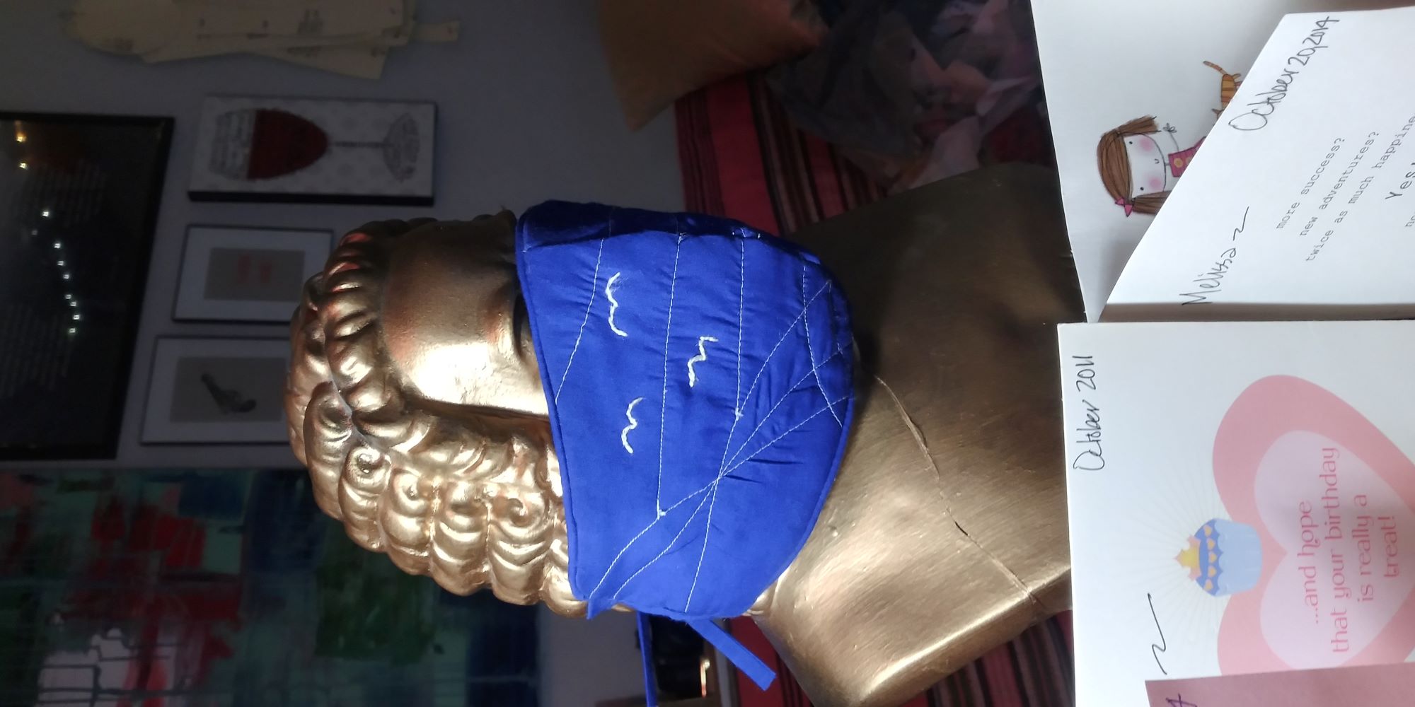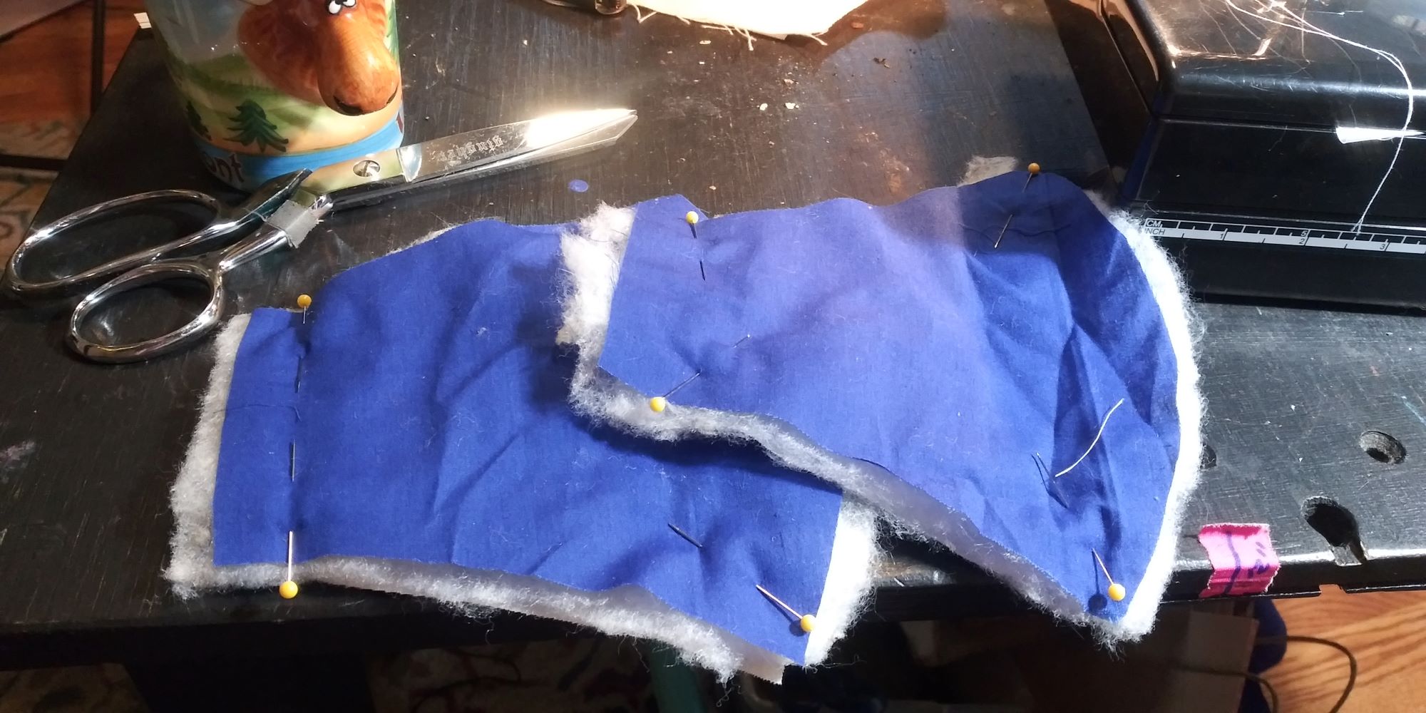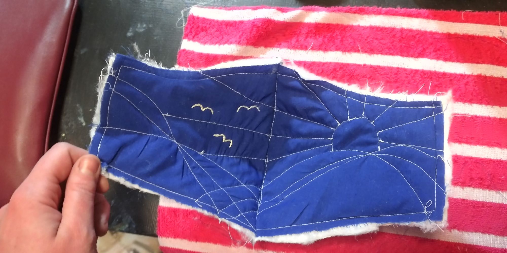 The interior of the mask is quilted. I didn’t decide on the pattern until I had to put thread to fabric. The rolling fields remind me of Iowa, where I went to graduate school and my mother was able to visit with my sister for my MFA graduation. I always drew birds like that when I was little. They make me smile.
