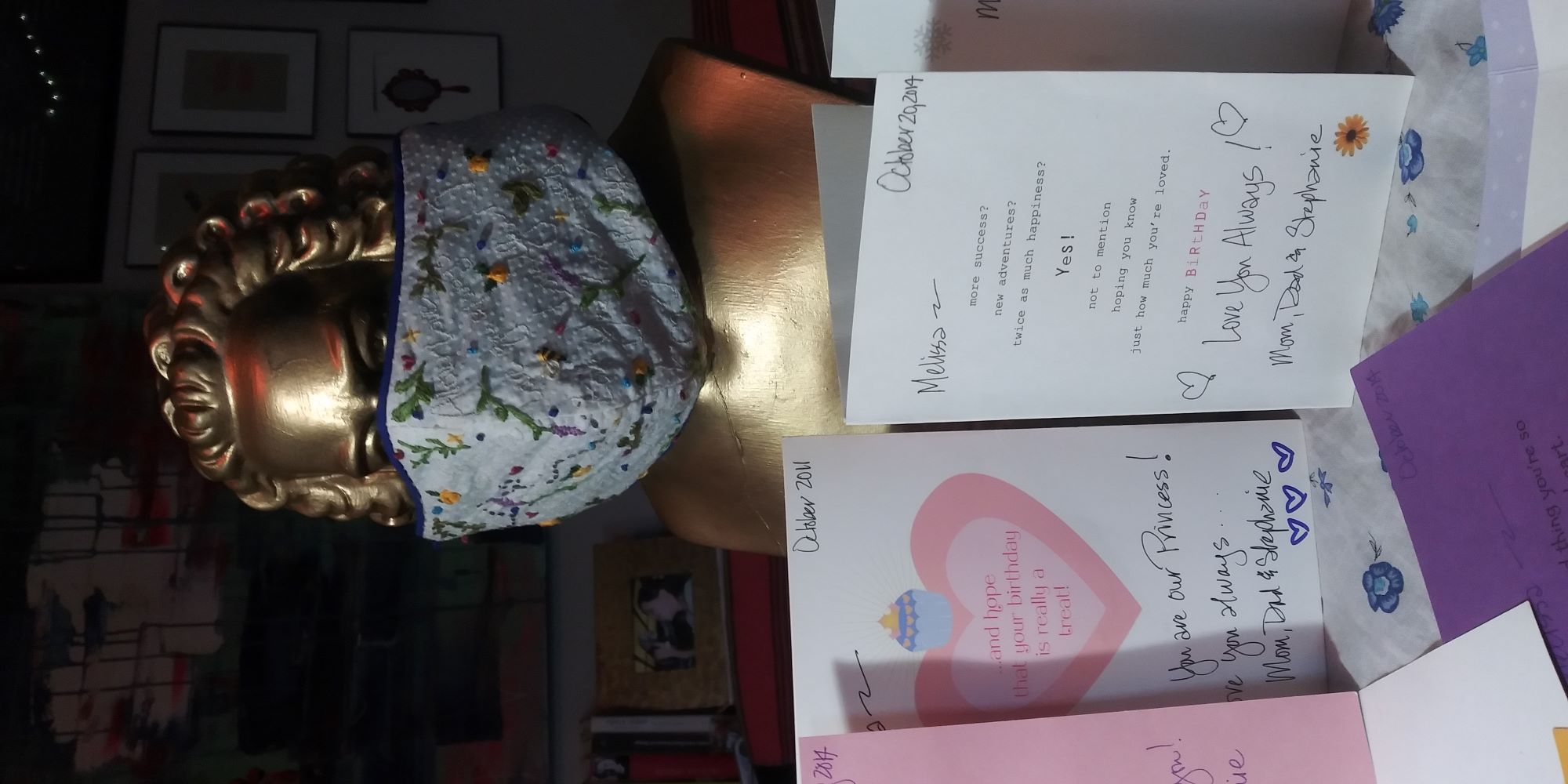 Love itself is an action. There are unlimited ways to show love, to participate in love, and to receive love. Today the easiest way is to wear a mask. I have lived on the opposite side of the country from my family for over a decade now. My mother religiously sends me cards and I’ve lost count of how many are floating around between books, in boxes, framed, or standing on my shelf every day reminding me that I am loved. These cards are what influenced the creation of my mask.