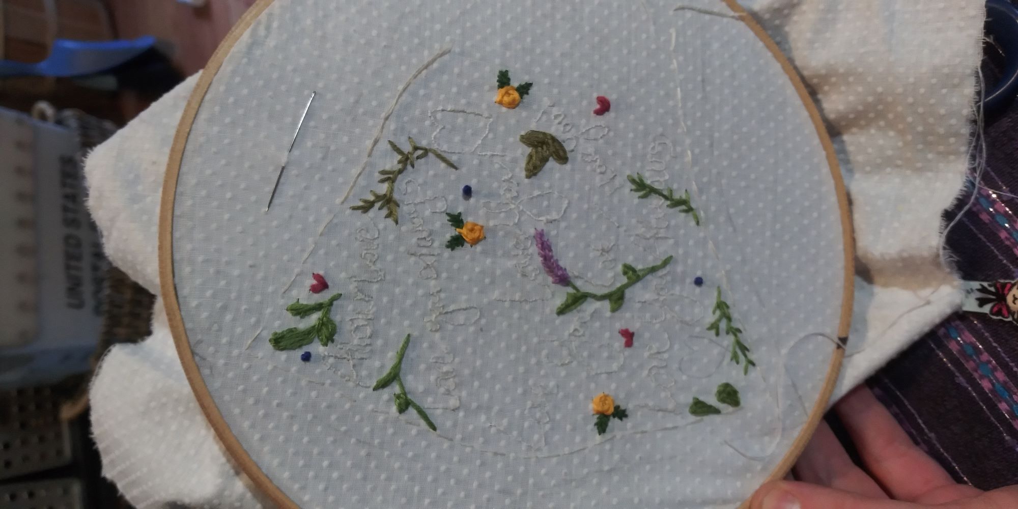 With each “I Love You” that I embroidered I was able to surround myself in memories. At times like this when distance is our greatest weapon and masks our strongest armor these words are a talisman. Each time this or any mask is worn it is an act of love. It is saying to our neighbors that though I cannot hold you I love you.