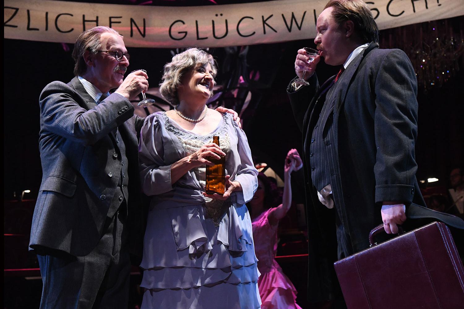 One such moment takes place during the engagement party in Herr Schultz’s fruit shop at the end of Act One. When Herr Ludwig reveals that he is a member of the Nazi party, Cliff sees the swastika around his arm and immediately starts to regret his close friendship with Ernst. Cliff takes a seat by the audience on-stage seating, takes out a cigarette, ponders over the 75 marks Ernst has just given him in return for a political errand, and puts the money back into Ernst’s pocket. Without having to share a verbal or physical interaction with anyone else on stage, this small silent gesture signifies Cliff’s moral and political values. Another moment in this scene that was eye-catching was the final moment when party goers are singing their political anthem “Tomorrow Belongs to Me”. As the song comes to an end, Sally starts peeling an orange in front of where Herr Schultz is standing. In our Facebook Live stream, Alexandra Silber recalls that this was a moment she had planned and created, as it is a symbol of an ignorant bystander eating away at the lives of Jewish people, such as Herr Schultz. The last moment in this scene that haunted me is a detail I hadn’t noticed until a week before closing. Kathryn Burke, the other spotlight operator and electrics apprentice, pointed out that in the last few seconds of Act One, ensemble members Connor James Reilly and Ben Gunderson are pointing to a bathroom off stage. Right before the lights go out on the party, Ben slowly turns his point into a heil. While the Jewish members and people of color stand on the outside of the party circle, the others have completely turned the jovial room into a political nightmare. Even though the dialogue provides the main action within this scene, the background moments help provide color and depth that I started to further appreciate each time I watched it.