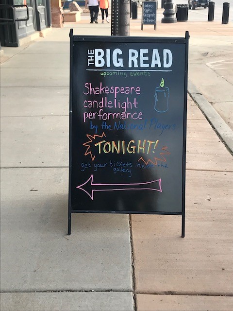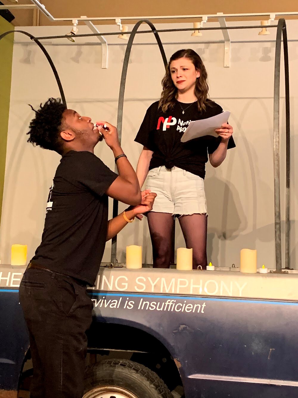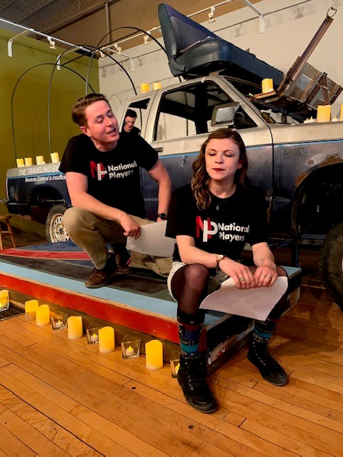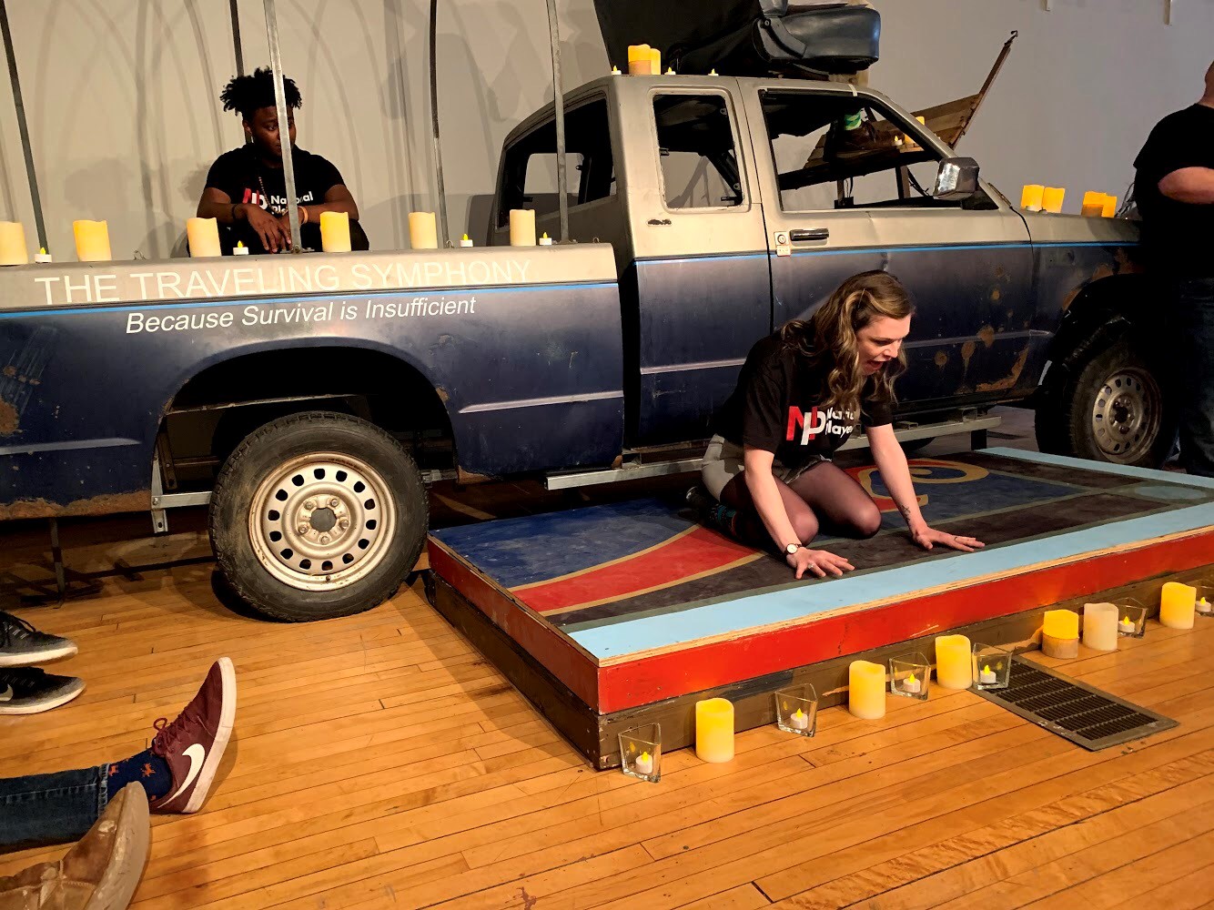 As part of a local project titled “The Big Read,” we were invited to perform some guerrilla Shakespeare scenes in an art gallery attached to the opera house. We performed on one of the neatest sets I have ever worked on. “The Big Read” included several art projects inspired by the novel Station Eleven, written by Emily St. John Mandel. The novel follows a troupe of travelling Shakespeare actors in a future where a massive plague has wiped out most of civilization. The actors travel in a horse drawn pickup truck. On the truck’s side reads, “The Traveling Symphony: Because Survival is Insufficient.” The local high school’s welding department created a replica of this truck and built it into a stage! It felt very special to be part of this event. I read the novel a few years ago at the recommendation of my sister and her boyfriend and was so stoked to be part of this project. I think that sums up why a lot of us join something like the National Players or make art at all, really—because survival is insufficient.